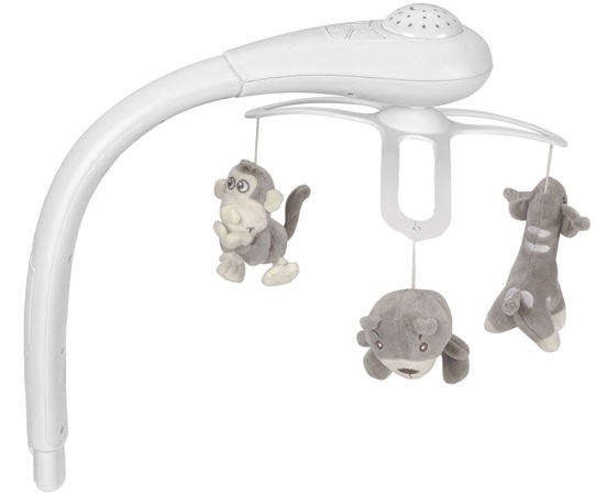Zestaw zawiera również karuzelę z trzema obracającymi się zabawkami, które przyciągają uwagę malucha i wspierają jego rozwój sensoryczny.