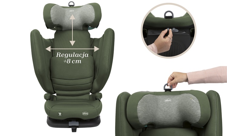Równie istotna jest regulacja szerokości oparcia, która działa niezależnie od zagłówka. Cztery poziomy rozszerzenia (+8 cm) gwarantują więcej przestrzeni na ramiona i wygodę nawet dla starszych dzieci. To rozwiązanie, które realnie wpływa na komfort podczas długich podróży.