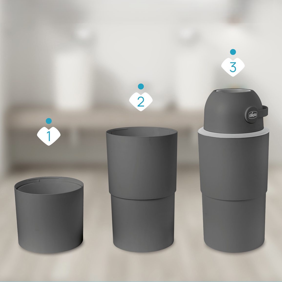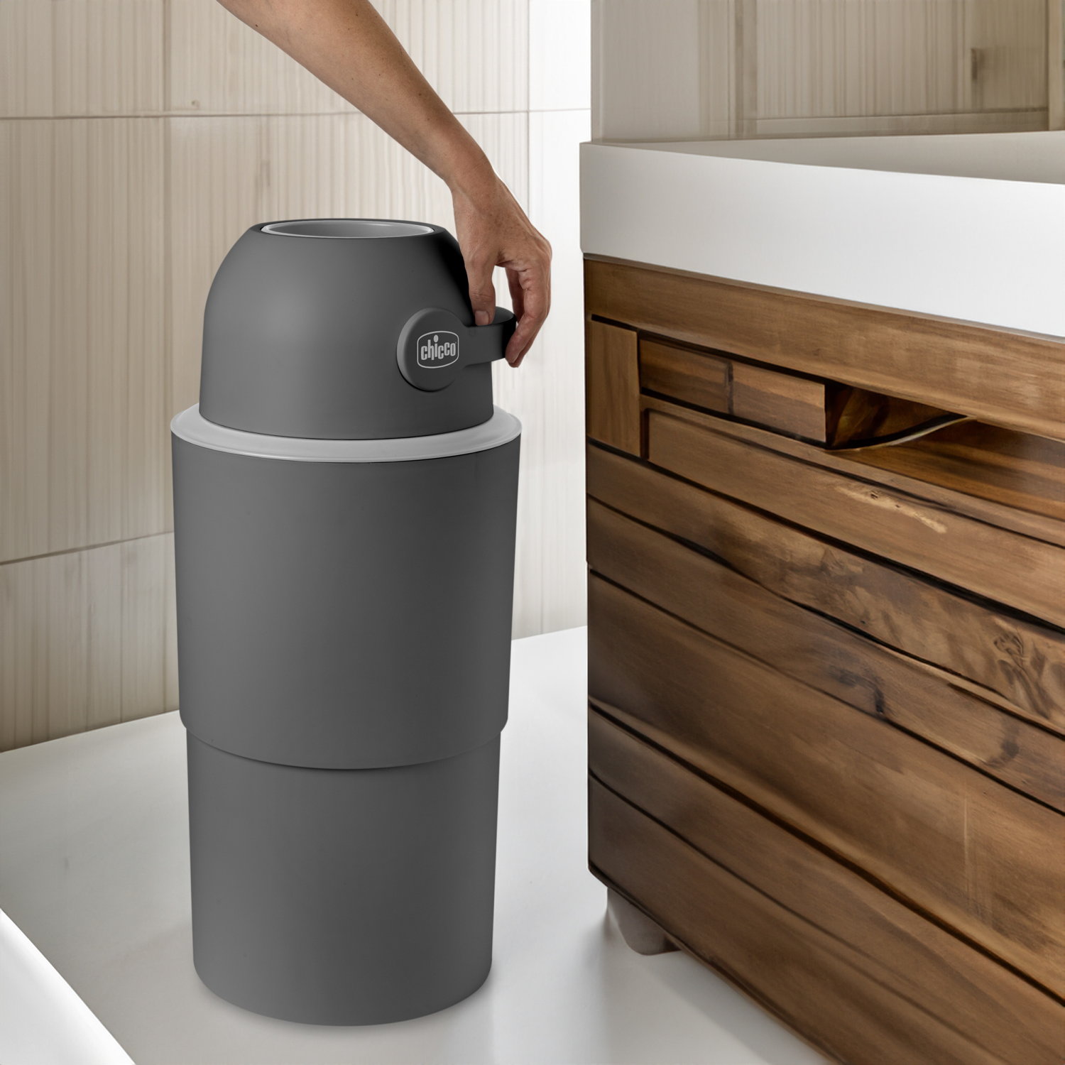 Dzięki teleskopowej konstrukcji pojemnik na pieluchy firmy Chicco można w łatwy sposób zmniejszyć na czas transportu lub przechowywania, co pozwala zaoszczędzić miejsce. Wykonanie z materiałów zawierających 50% plastiku z recyklingu podkreśla proekologiczny charakter produktu, a kompaktowy kształt i eleganckie, faliste linie sprawiają, że doskonale komponuje się z każdym wnętrzem.