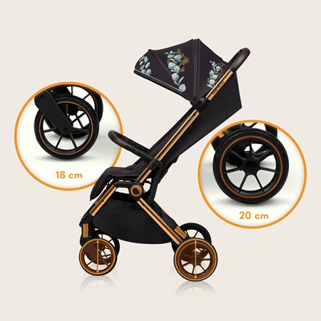 Lionelo Cloe został wyposażony w wytrzymałe koła EVA z powłoką poliuretanową. Są nieprzebijalne i nie wymagają pompowania, a jednocześnie oferują wysoki komfort jazdy. Podwójna amortyzacja – zarówno z przodu, jak i z tyłu – skutecznie redukuje wstrząsy, dzięki czemu spacer pozostaje przyjemny nawet na kostce brukowej czy leśnej ścieżce.