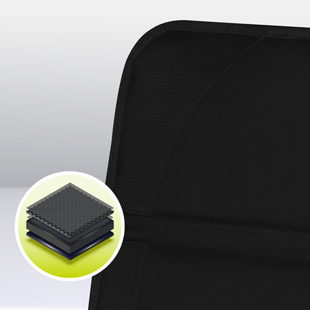 Bezpieczeństwo to nie tylko fotelik, ale również jego stabilne podłoże. Spód maty pokryto antypoślizgową siatką z pianki PVC, a dodatkowa listwa umieszczona z tyłu minimalizuje ryzyko przesuwania się produktu podczas jazdy. Brzegi wzbogacono o 10 paneli z ekologicznej skóry, które zwiększają przyczepność i jednocześnie chronią wnętrze auta przed zabrudzeniem.
