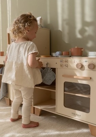 Drewniana kuchnia firmy Little Dutch pozwala maluchom gotować, piec i podawać ulubione potrawy. Wyposażona w palniki, piekarnik oraz półki, zachęca do odgrywania codziennych scenek – od pieczenia ciasta po gotowanie warzyw dla ukochanych pluszaków. Ilustrowane przyciski i pokrętła wyglądają niezwykle realistycznie, co dodaje zabawie autentyczności.