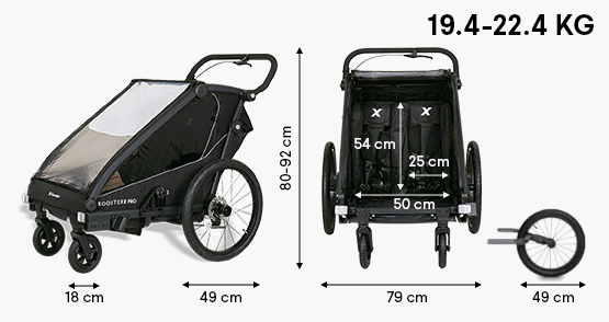 Przestronne wnętrze pozwala przewozić dwoje dzieci lub jedno dziecko wraz z dodatkowym bagażem, przy maksymalnym łącznym obciążeniu do 45 kg.