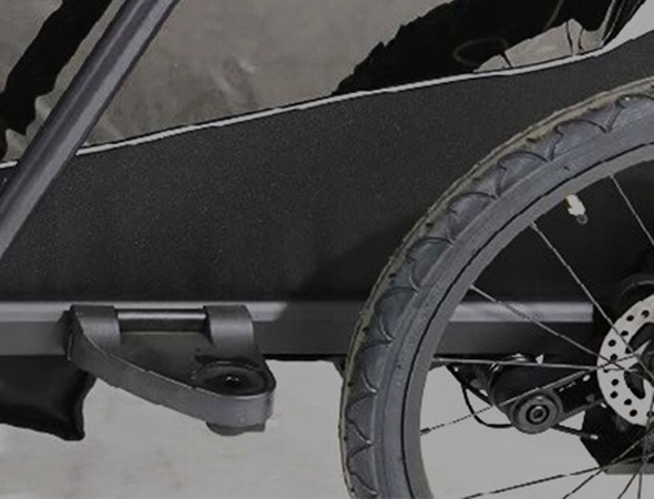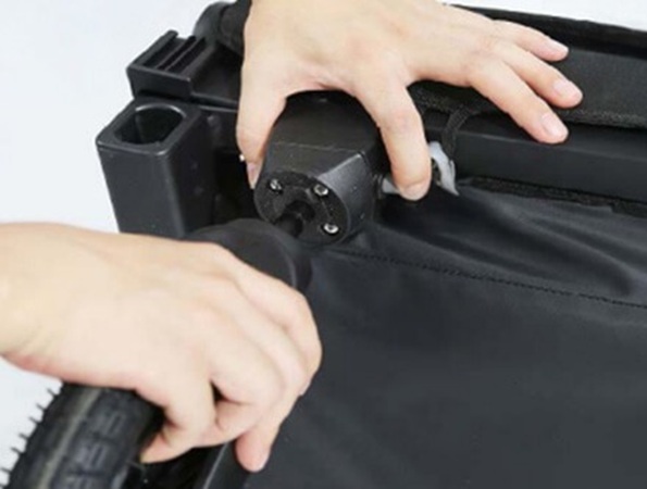 Koła można zdemontować wraz z tarczami, a sama przyczepka składa się w prosty sposób, dzięki czemu bez trudu zmieści się w bagażniku samochodu. Osłony kół chronią dzieci przed zabrudzeniami oraz poprawiają estetykę całej konstrukcji.